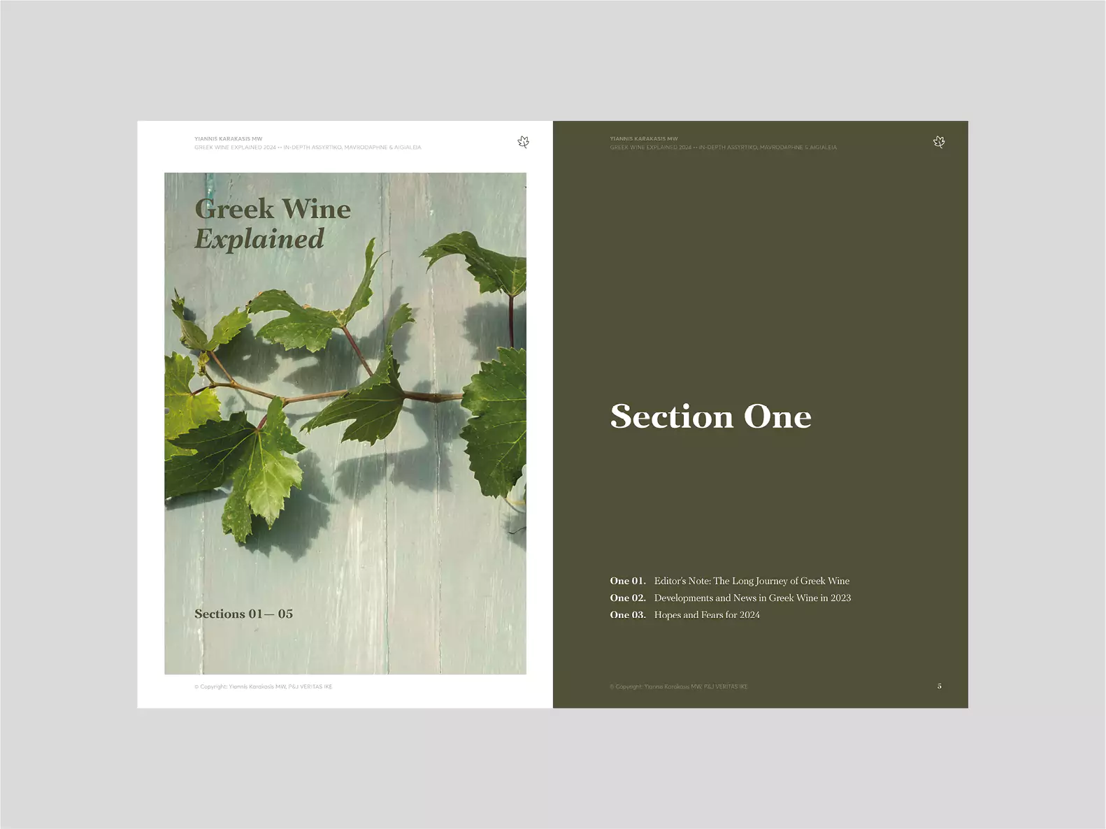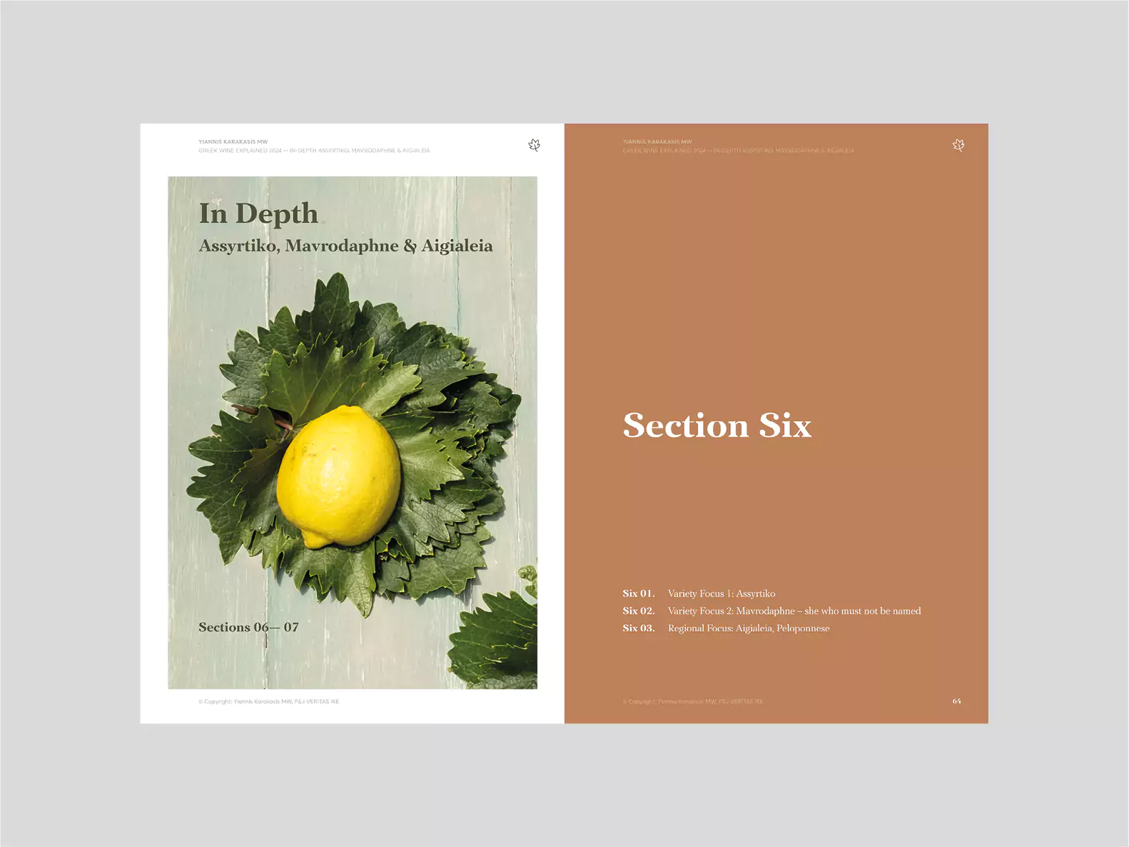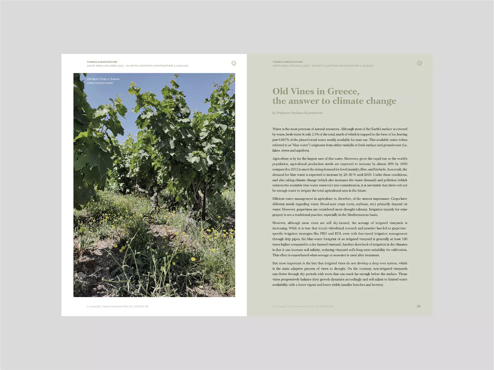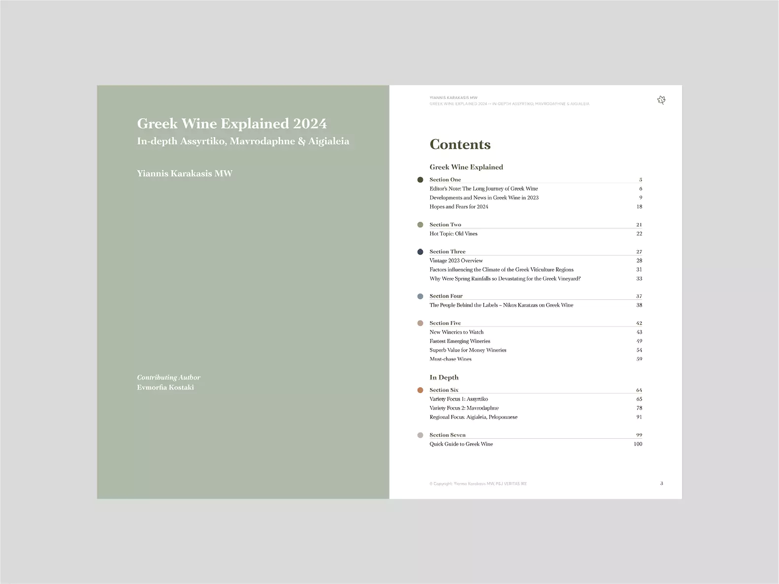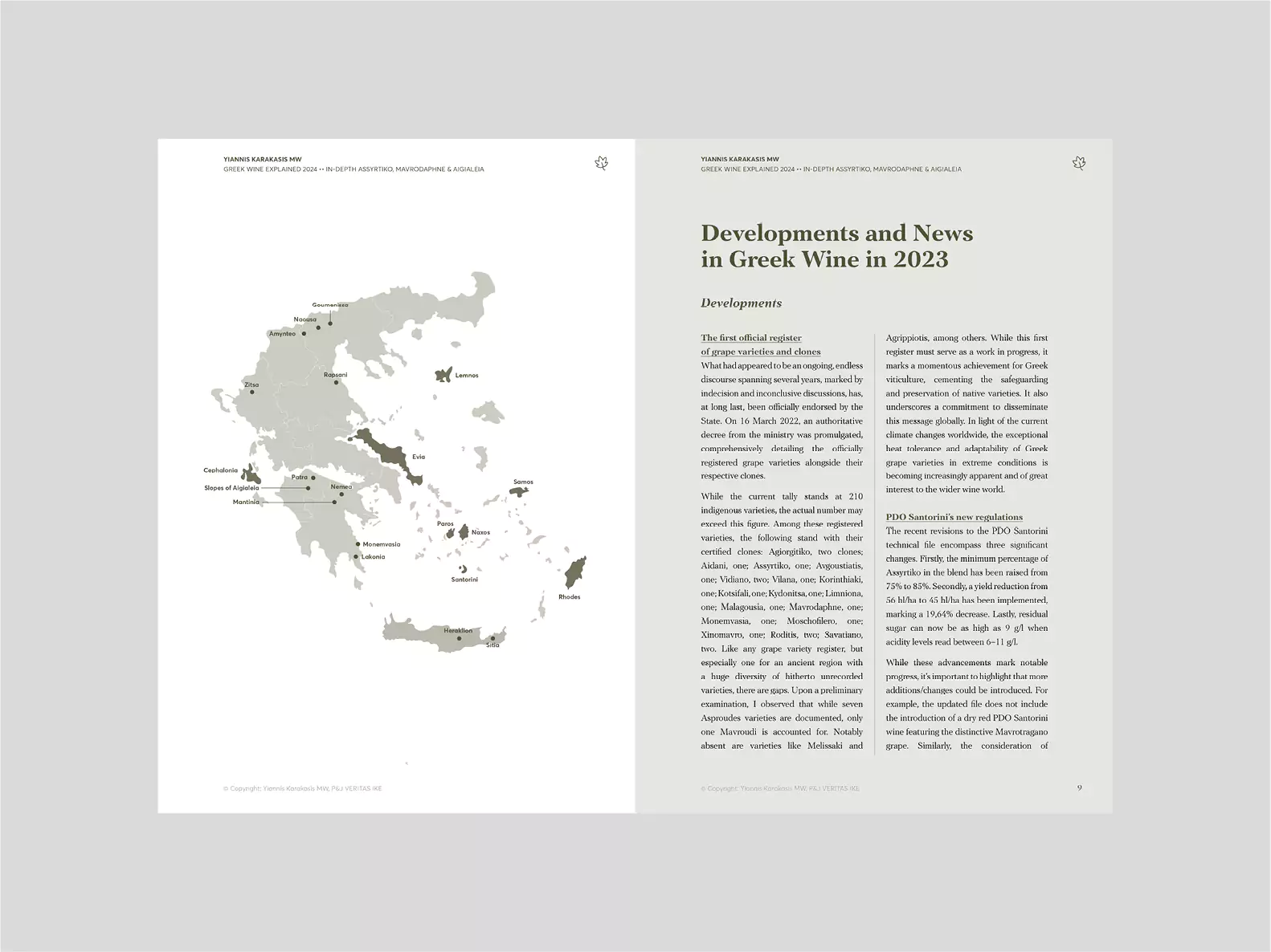 In the In-Depth section, the varieties Assyrtiko and Mavrodaphne and the Aigialeia region are analysed in detail. These topics will change each year. The final chapter includes information on all Greek grape varieties, as listed in the national catalogue, and will be enriched over time.