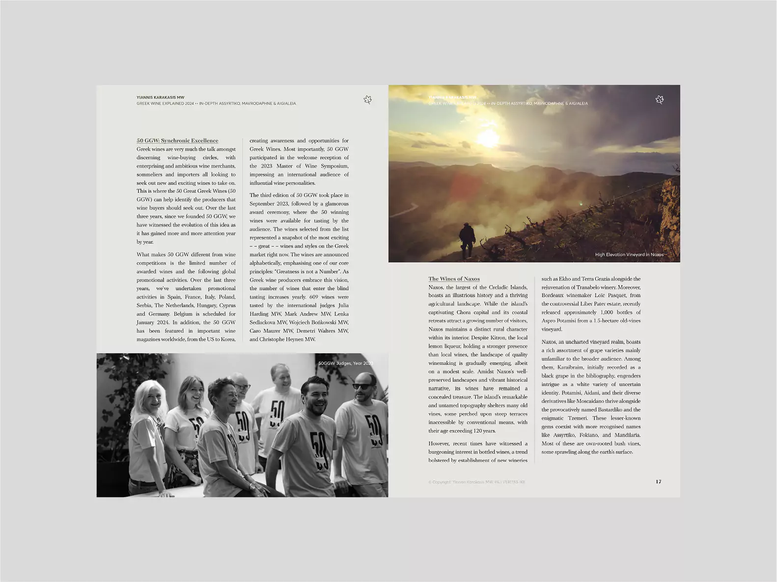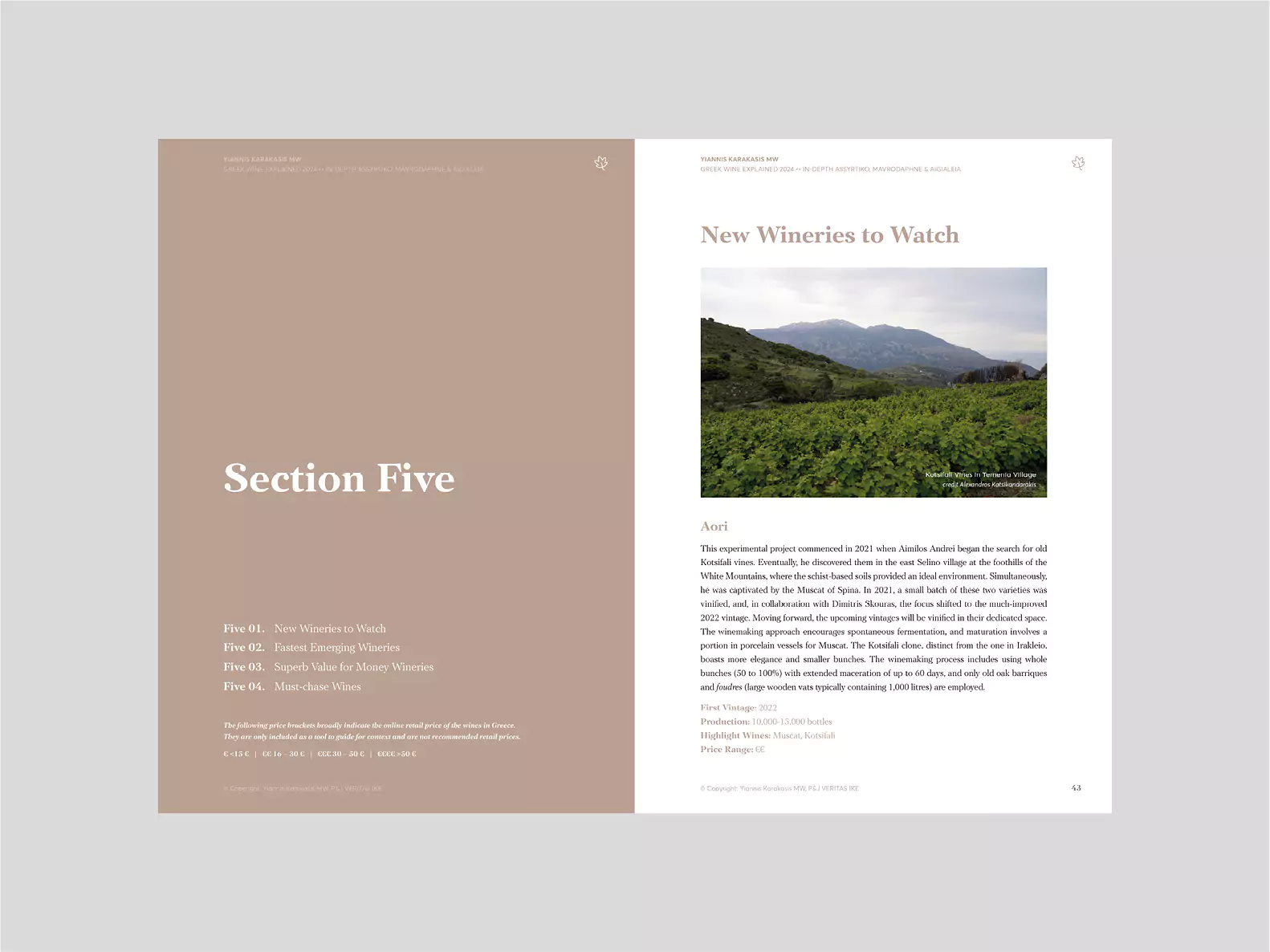 The section Greek Wine Explained covers news and developments in the Greek wine industry from the past year, focuses on the challenges faced by old vineyards and reviews the 2023 vintage. Moreover, it includes an interview with Nikos Karatzas, one of the most talented Greek winemakers. It provides lists of new and emerging wineries, along with value-for-money proposals and wines not to be missed.